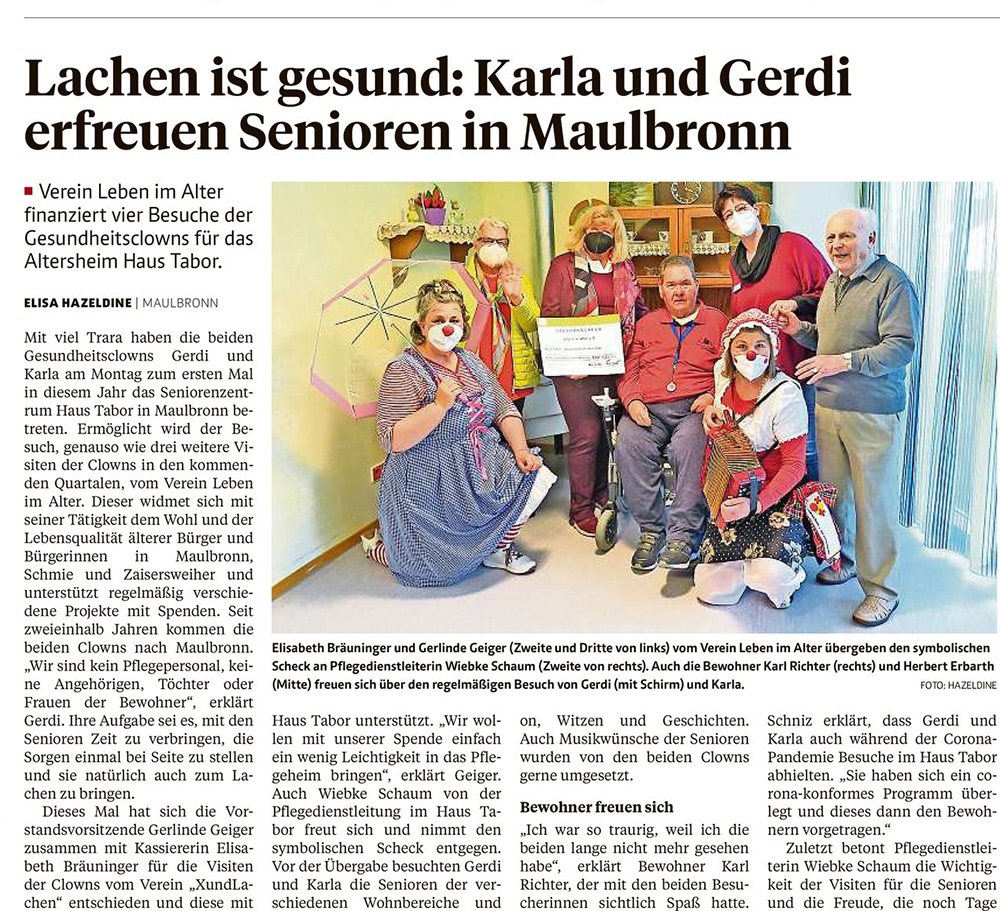 Das Xundlachen-Duo Karla und Gerdi spielt regelmäßig seit zweieinhalb Jahren im Seniorenzentrum Haus Tabor in Maulbronn. Jetzt hat der Verein "Leben im Alter" der Pflegedienstleiterin Wiebke Schaum eine Spende überreicht, mit der die nächsten beiden Duo-Visiten der Klinikclowns gesichert sind. Da freuen sich nicht nur Karla und Gerdi wie Bolle, sondern auch die Bwohnerinnen und Bewohner. Auf dem Bild zu sehen sind Gerdi (mit Sonnenschirm", Elisabeth Bräuninger (Leben im Alter e.V.), Pflegedienstleiterin Wiebke Schaum (stolz mit Scheck), der Bewohner Herbert Erbarth (im Rolli), Gerlinde Geiger (Leben im Alter e.V.), Karla (mit Akkordeon) und Bewohner Karl Richter (stehend). Toll dass alle zur Scheckübergabe zusammen gekommen sind und sich von der ansteckend guten Clowns-Atmosphäre im Haus Tabor ein Bild machen konnten. Vielen Dank an den Verein Leben in Alter, der mit Karla und Gerdi Leichtigkeit in den Pflegealltag bringt, sagt auch Xundlachen e.V..